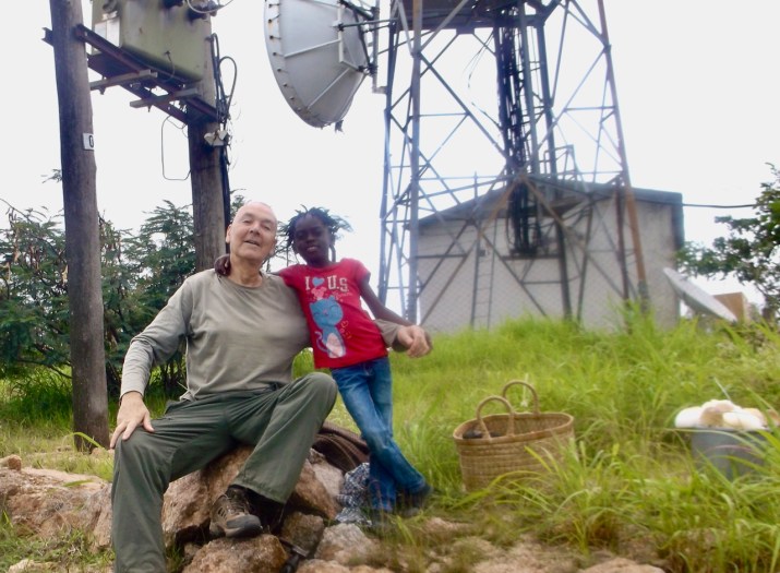 The Internet here is random. I get an ok signal some of the time, but the nearest server for my provider is Harare, some 300 miles away in Zimbabwe, and the nearest transmitter is Mount Mphangwe about 10 miles across country. I have to try and get in line of sight with that transmitter to get a fair signal. If the weather is good I balance the mobile up one of Alice’s mango trees in line with that mountain transmitter, the laptop sits on a pile of concrete blocks next to the washing up buckets, and we get a good enough signal for a bit of Zoom with Swamiji. (We climbed up the tower of that transmitter a couple of years ago on a breakfast picnic jaunt up the mountain; the maintenance guy was a friend of a friend and said… climb… no problem. Imagine them letting you do that in the UK!)